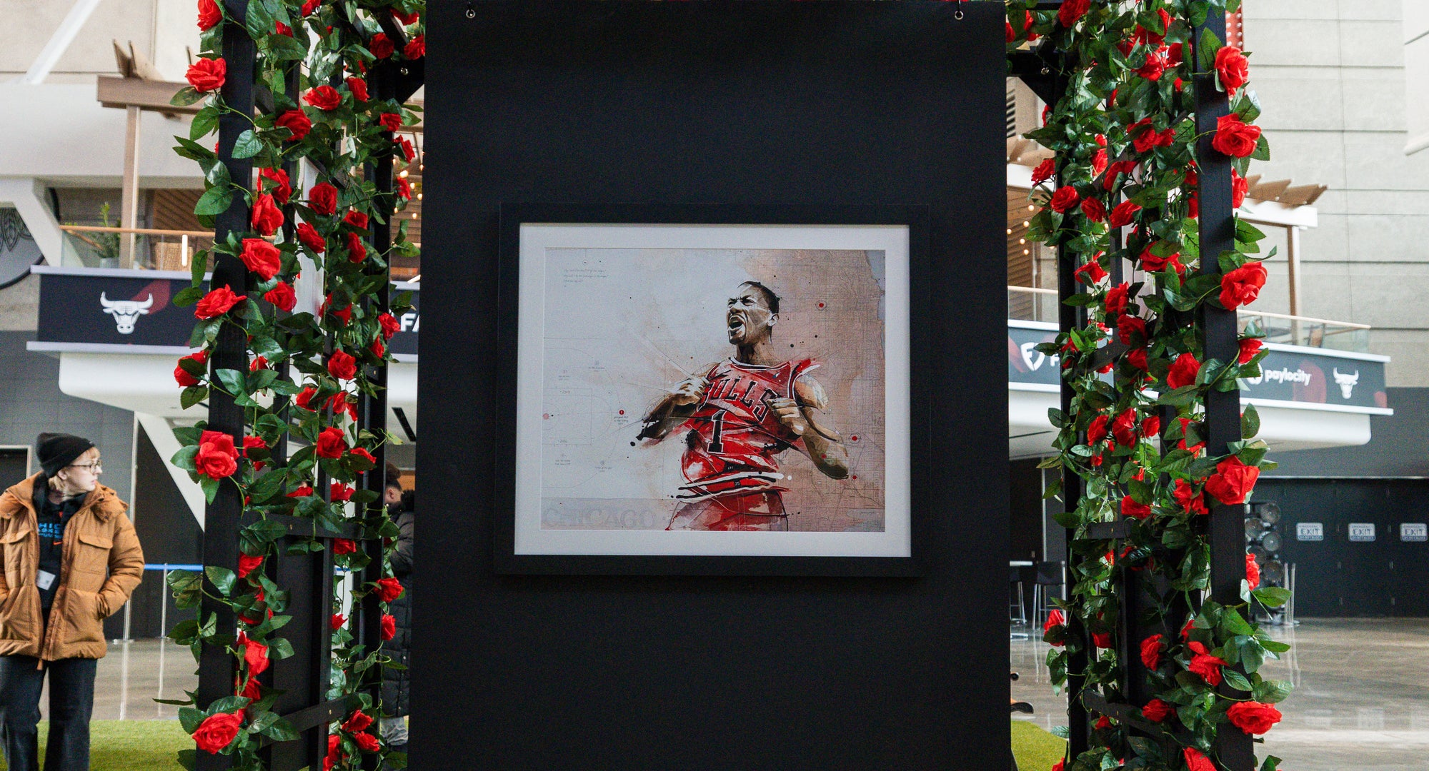 An original artwork commissioned by the Chicago Bulls to honor a landmark moment in franchise history: the retirement of Derrick Rose’s jersey at the United Center stadium.
